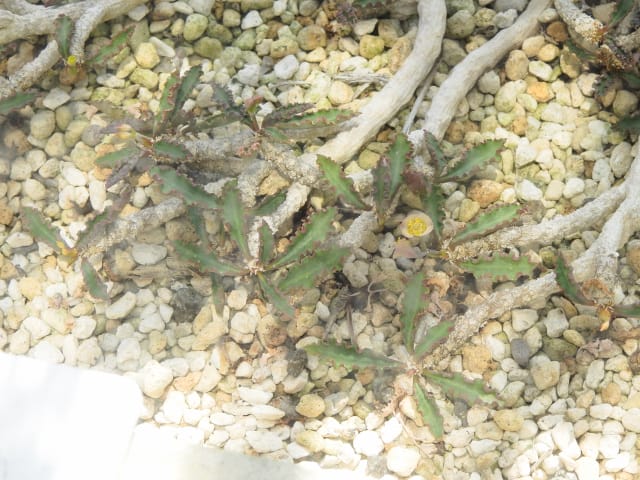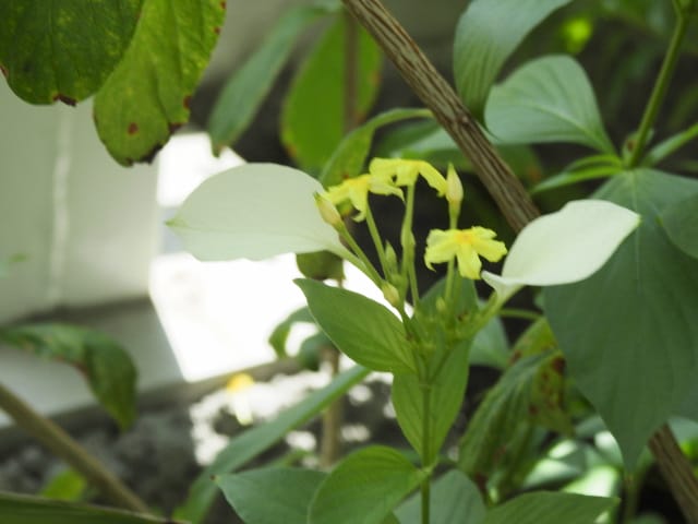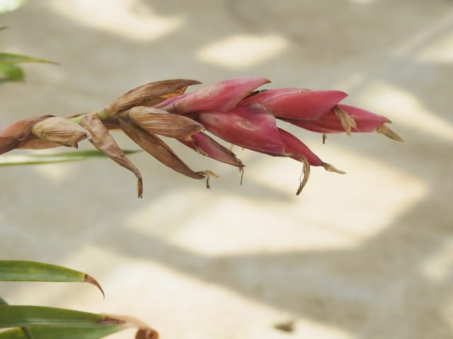 名古屋市東山植物園温室の花&実25/09/02 8月15日に引き続いての訪問です。 多肉植物室(以下、「多肉室」と略記)では、初花のアロエ=イサロエンシスが開花し、ユーフォルビア2種(‘黒摩利支天’・カプサインテマリエンシス)が咲き残っていましたが、ウェルウィッチア科‘奇想天外’の花は枯れていました。 西花卉室では、リュエリア=キリオサ・パイナップル科フリーセア=ナナが咲き残っていました。オンシジウム=パナメンセは花が萎れていました。 中央ヤシ室では、インドソケイが咲き出し、バショウ科‘地湧金蓮’・オジギソウ・ヘリコニア=プシッタコルム?が元気で、カラテア=ロウイサエ・ヤエヤマスズコウジュが咲き残り、メディニラ=クラサタが花期を終え、オガサワラビロウの実などが残留していました。 東花卉室では、ポリガラ=ダルメシアナムが咲き出し、グロッバ=ウイニティイ・ウスギコンロンカ・オリヅルラン・ペンタス=ランケオラタ・キツネノヒガサ、などが元気で、グロッバ=ションパーキー・プルメリア・コエビソウ・グレビレア‘キングスレインボー’・プセウデランテムム=アクミナティッシムムなどが咲き残っていました。 香りの有用植物室(以下、「香り室」と略記)では、ラベンダー‘ブルースピアー’が元気で、サンユウカ・イランイランノキ・ハナシュクシャ・ヒョウモンラン・マツリカなどが咲き残っていました。 |