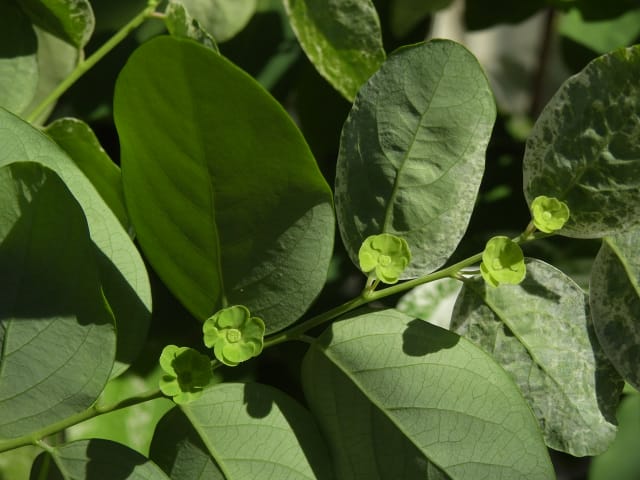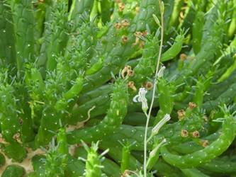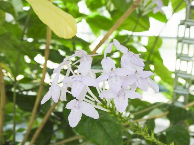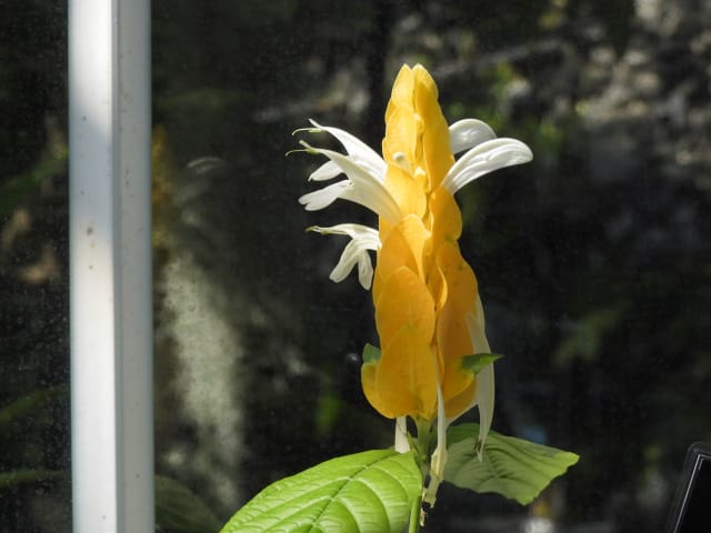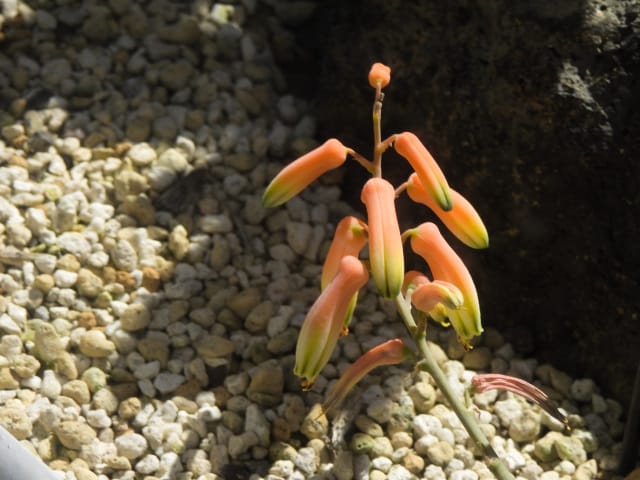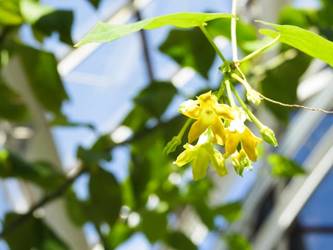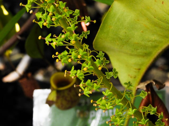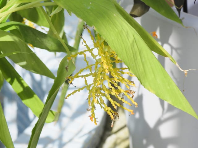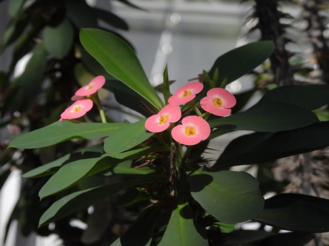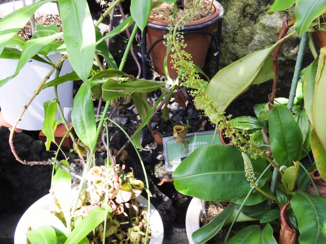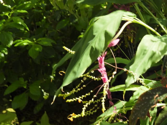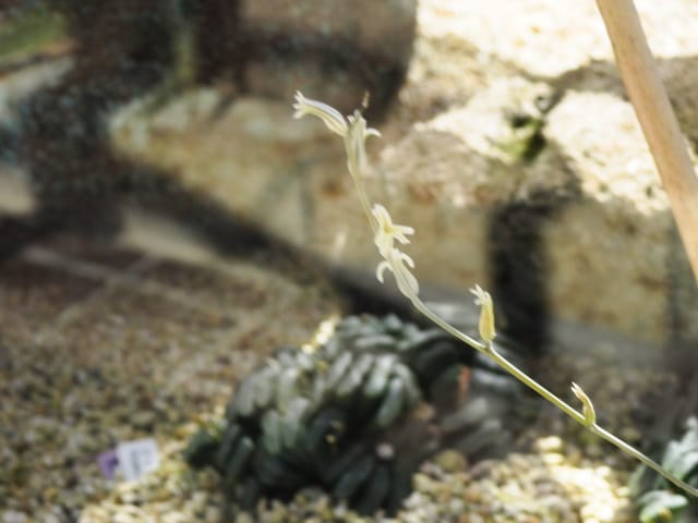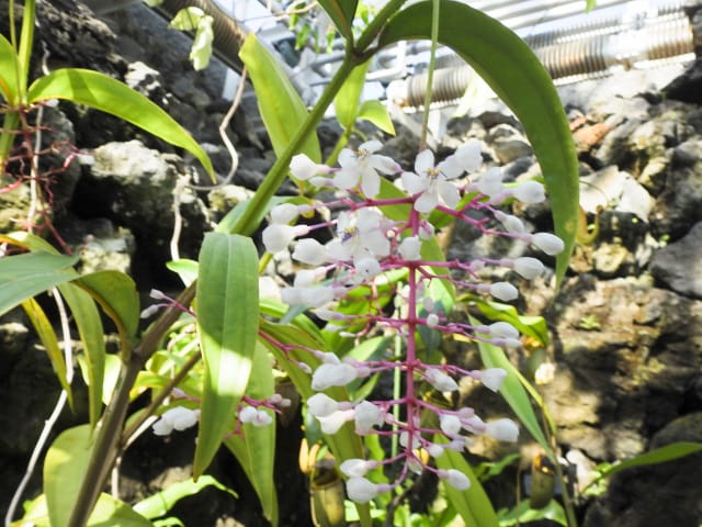名古屋市東山植物園温室の花&実25/10/17 前回訪問時に蕾だった、多肉植物室のアロエ=デスコイングシイ、西花卉室のアオイ科パロボラチョ、東花卉室のキョウチクトウ科‘王犀角’・モクレン科トキワレンゲ、の開花、などを期待して訪れました。10月2日に引き続いての訪問です。 多肉植物室(以下、「多肉室」と略記)では、アロエ=デスコイングシイが3花序ほど咲き出しており、ユーフォルビア‘黒摩利支天’が元気で、ツルボラン2種(‘玉扇’・‘青竜’)が、咲き残っていました。 西花卉室では、アオイ科パロボラチョは、蕾のままでしたが、ティランジア=ヴィセンティナが咲き出し、リュエリア=キリオサが元気でした。 中央ヤシ室では、ウツボカズラが咲き出し、ヤエヤマスズコウジュが復活開花し、バショウ科‘地湧金蓮’・インドソケイ・オジギソウ・ヘリコニア=プシッタコルム?・メディニラ=クラサタが咲き残り、キヤニモモの実、オガサワラビロウの実、が元気でした。 東花卉室では、キョウチクトウ科‘王犀角’は展示から外されており、モクレン科トキワレンゲは花後になっていましたが、初花のキツネノマゴ科2種(パキスタキア=ルテアに似たウコンサンゴバナと、エクボリウム=リグストリヌム)が開花し、サンアブラギリ・アサバソウ・カリアンドラ=エマルギナタ・ボルネオソケイ・イセハナビ・キャッツテイル?が咲き出し、グロッバ2種(ウィニティイ・ションパーキー)・ポリガラ=ダルメシアナム・ウスギコンロンカ・ヨウシュコバンノキ・プセウデランテムム=アクミナティッシムム・ペンタス=ランケオラタ・キツネノヒガサ、が、咲き残っていました。 香りの有用植物室(以下、「香り室」と略記)では、初花のメキシカン=スイートハーブが咲き出し、夜来香・プセウデランテムム=バリアビレが、1花序咲き出しており、イランイランノキが元気で、ハナシュクシャが咲き残り、オオバゲッキツの実が元気でした。 |