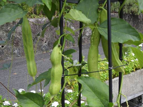 ナタマメの実&花(名古屋市東山植物園温室東入口脇鉢植え)25/09/17P