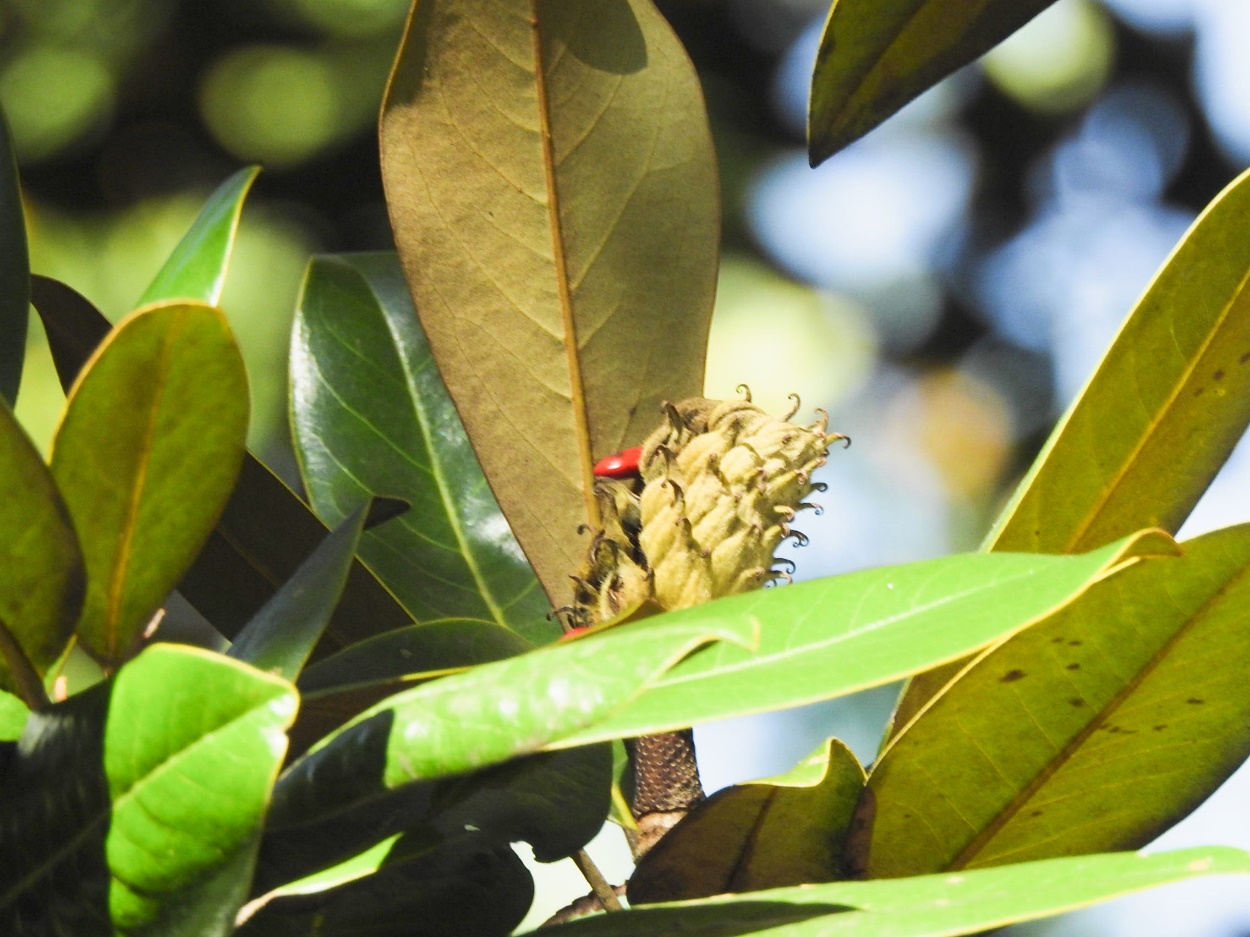 タイサンボクの弾け出した実(名古屋市東山植物園しゃくなげの森)25/10/17P