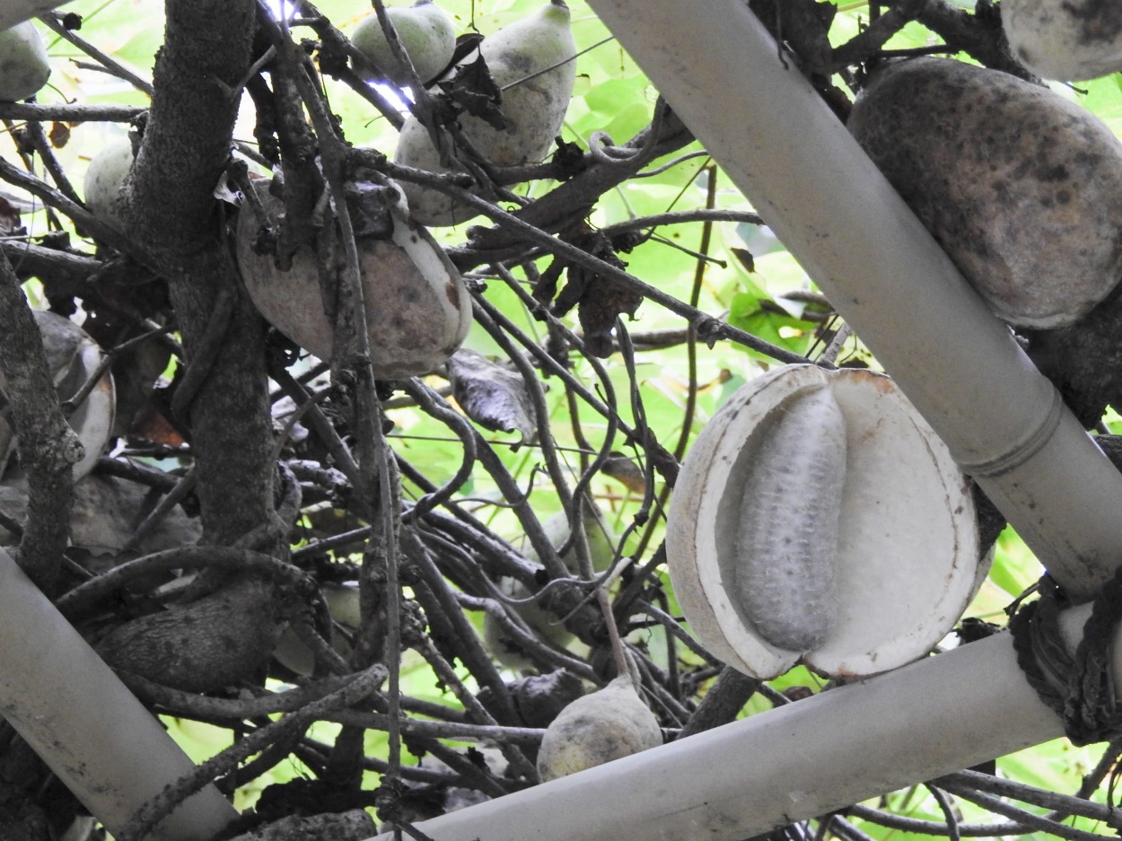 ミツバアケビの弾けた実(春日井グリンピア本館東アケビ棚)25/10/21P