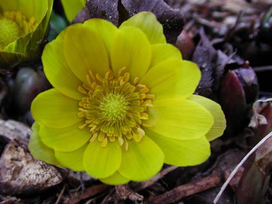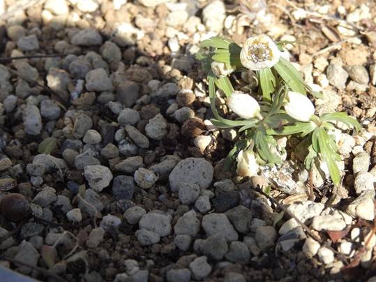 半開の、セツブンソウ(東谷山フルーツパーク温室入り口鉢植え)26/02/04P