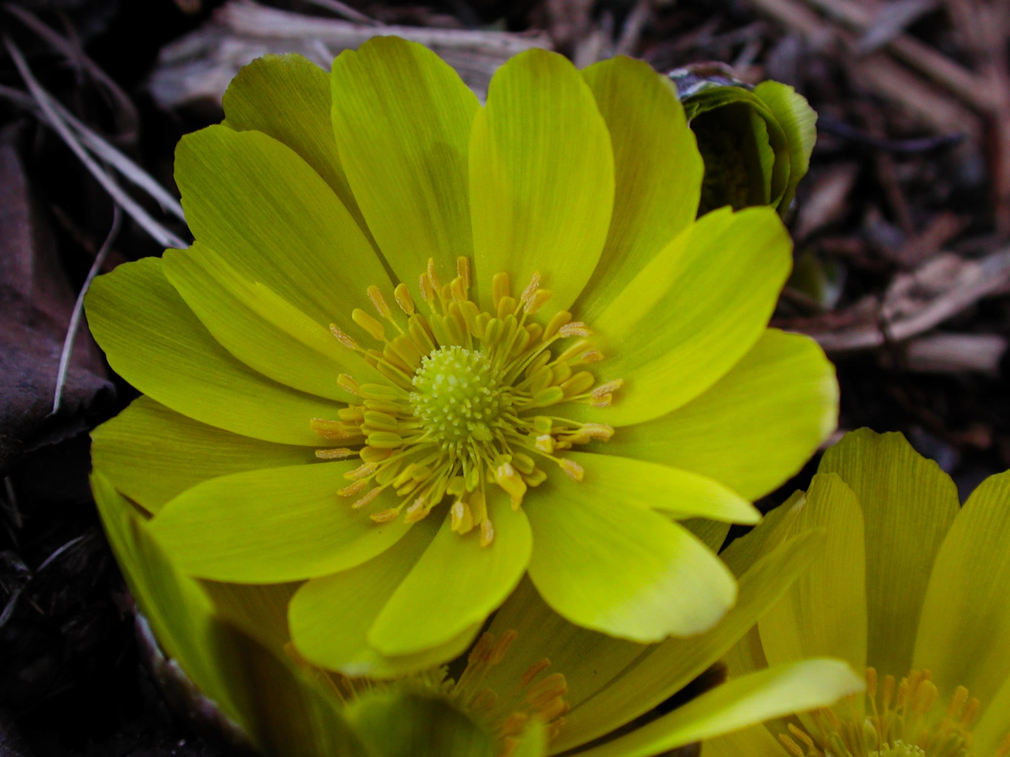 フクジュソウ。上と同花(東谷山フルーツパーク温室南)26/02/04P