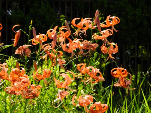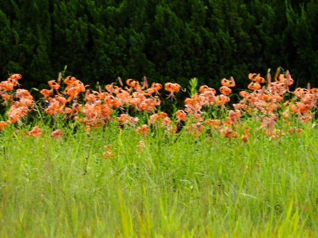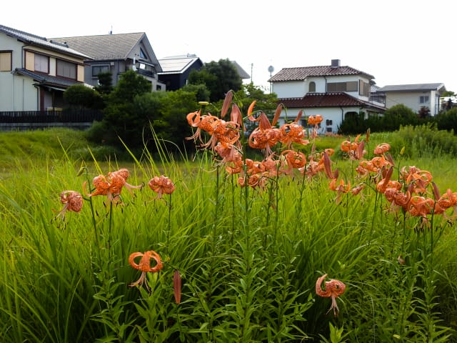 愛知県春日井市高森台自宅付近空き地25/07/20 満開のオニユリを期待して訪れました。7月12日に引き続いての訪問です。 オニユリは、50株以上が満開になり見頃でしたが、たまたま日が陰っており、写真の出来は今一でした。 |
