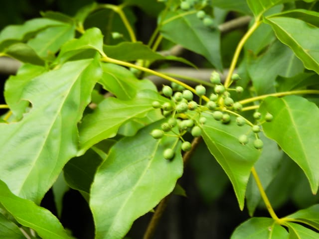 愛知県春日井市高森台自宅付近外周林25/07/20 「高森台4丁目」バス停で下車し、カエデドコロの開花を期待して、高森台外周林の内側を歩きました。 道中、タカノツメの実が多数生育していましたが、肝心のカエデドコロは、草体は茂っているものの、花は見当たりませんでした。 |