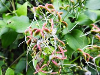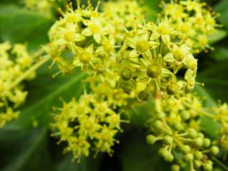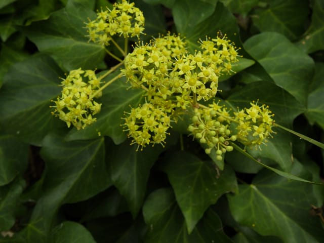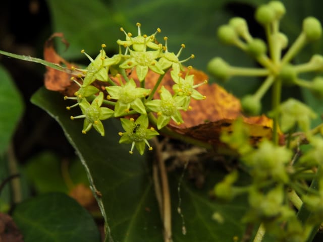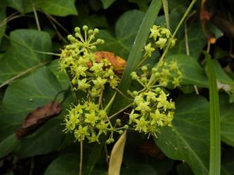 愛知県春日井市高森台外縁部25/10/10 アマチャヅル雌花の開花、満開見頃のキヅタ・アマチャヅル雄花、などを期待して訪れました。 9月24日に引き続いての訪問です。 しかし、どうした風の吹き回しなのか、いままで、長年、樹木やクズなどの草体に覆われていた、車道南脇は、地肌の石垣が露になり、綺麗さっぱり刈り込まれていて、アマチャヅル・クサギ・クズ・アオツヅラフジ・ノブドウなど、無かったかのように、全滅していました。 キヅタだけは、生息範囲が広かった為、残留しており、多数の花序が開花し、見頃でした。 |
