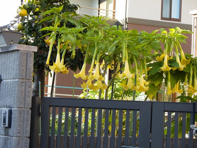 愛知県春日井市高森台1丁目民家庭25/11/15 JR高蔵寺に帰着したのは、14時50分過ぎ。 自宅最寄りバス停を通るバスの発車時刻は15時07分。 最寄りバス停の2つ手前のバス停で止まるバスの発車時刻14時56分に、間に合ったので、これを機に、高森台1丁目民家庭の、キダチダリアなどの様子を見る事としました。 10月7日に引き続いて訪れた、その場所では、 ダルマギクが終盤になり、撮影をパス。 キダチダリアは、日差しの具合で、良い写真にはなりませんでしたが、1輪が全開していました。 また、近くの民家庭では、エンゼルトランペットが見頃になっていました。 |
