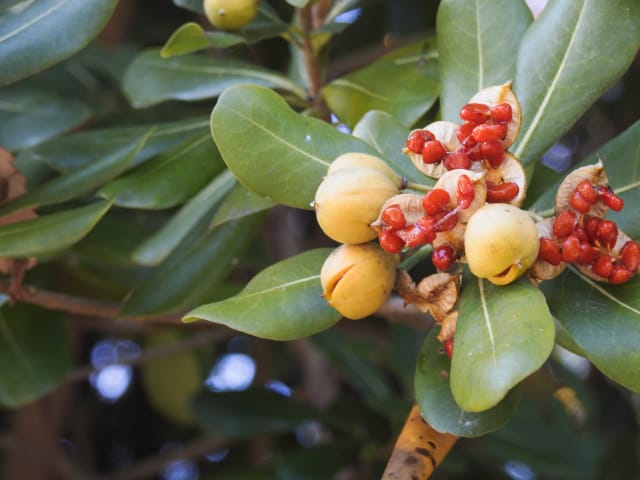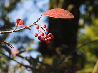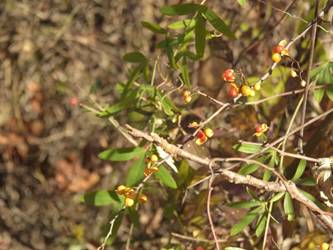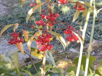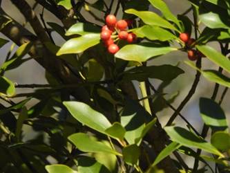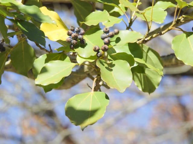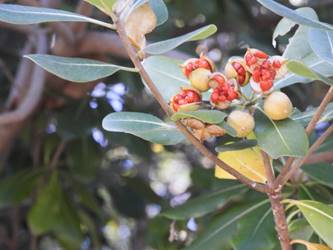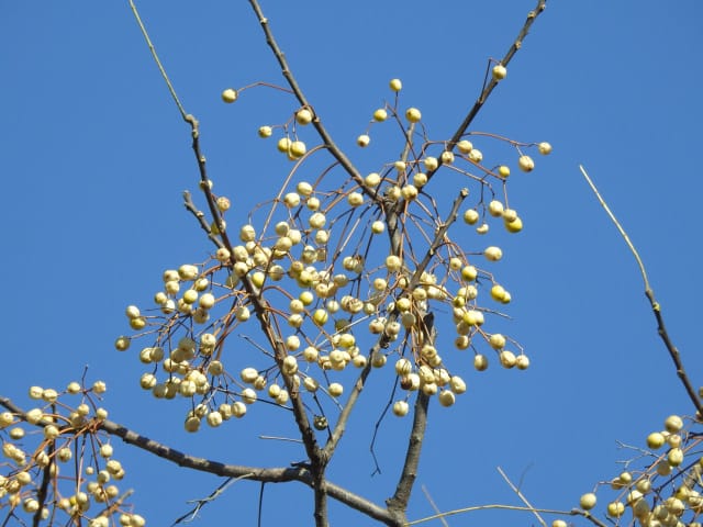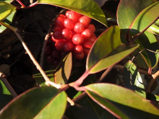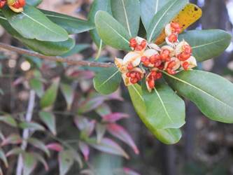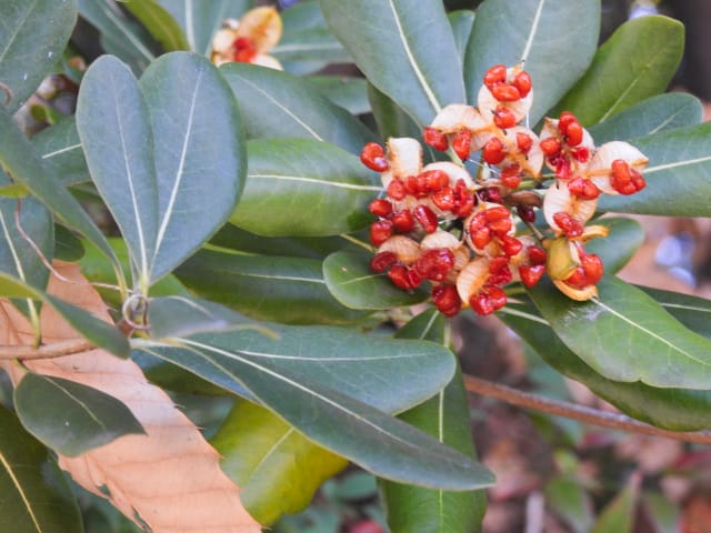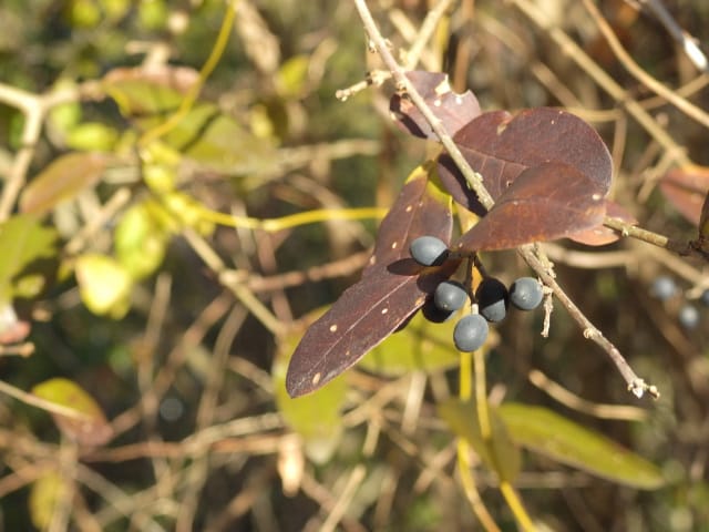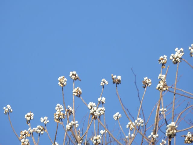 愛知県春日井市高森台外周林25/12/18 春日井グリンピアからの帰り道、「高森台4丁目」バス停で下車し、弾け切ったであろう、トベラの実の確認に訪れました。12月9日に引き続いての訪問です。 外周林内側の、トベラの実は、1株10花序の実が弾けており、内2花序の実が全開していました。 外周林外側では、ムラサキシキブの実が見頃を保っており、コバノガマズミの実が残留していました。 |