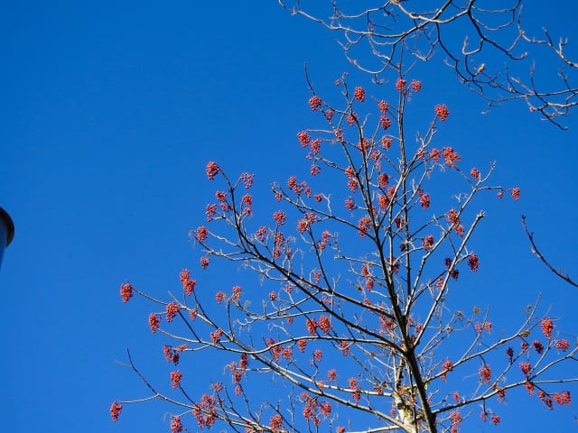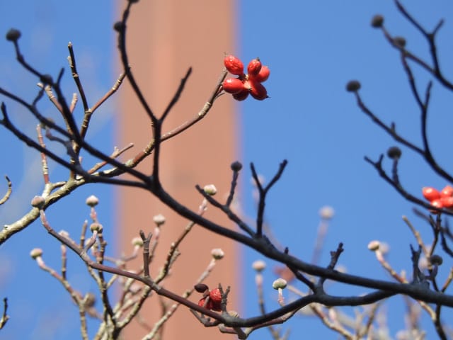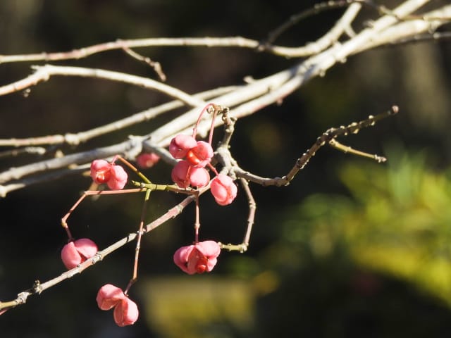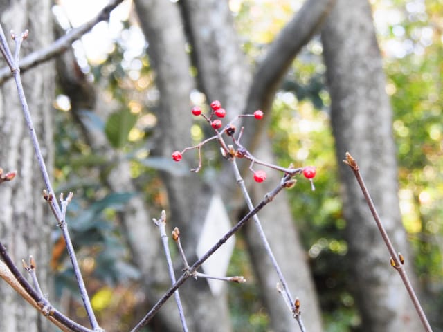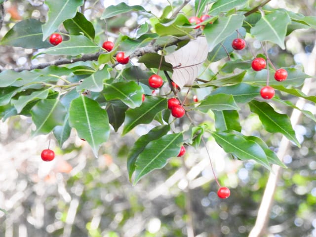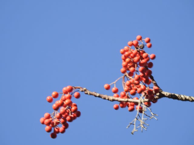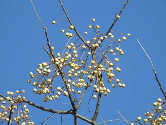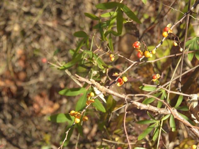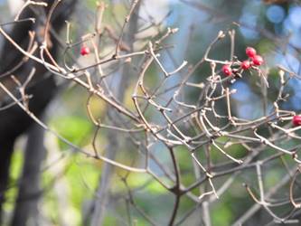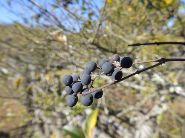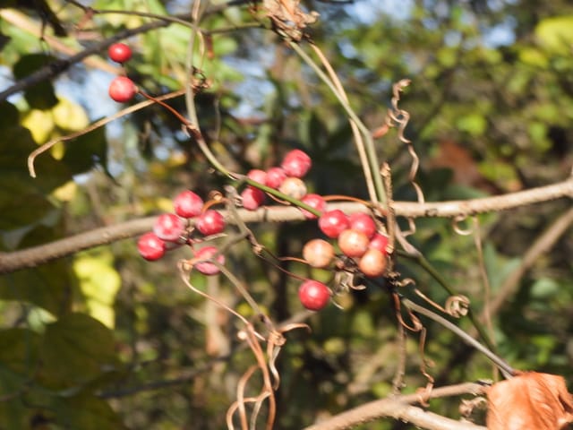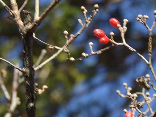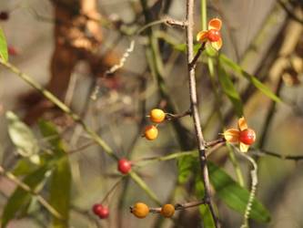 愛知県春日井市少年自然の家管理棟東脇25/12/18 ツルウメモドキの弾け切った実を期待して立ち寄ってみました。12月9日に引き続いての訪問です。 ツルウメモドキの実は、弾ける可能性のある実は、ほぼ弾け切った感じでした。 イイギリの実、イボタノキの実、は見頃を保っており、サルトリイバラの実も残留していました。 |