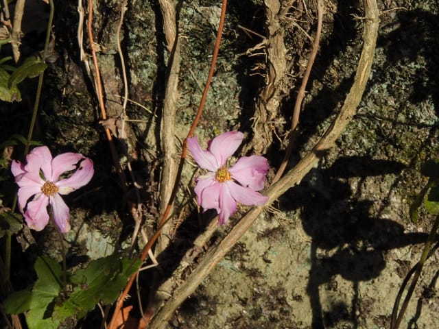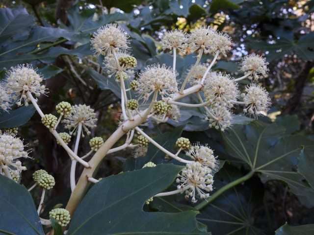 愛知県春日井市春日井グリンピア25/12/18 ロウバイ・新規椿、の開花、見頃のボケ・フイリヒイラギ・ジャノメエリカ、ヤツデの残留開花、見頃のトベラ弾けた実・サンシュユ実・コクチナシ実、などを期待して訪れました。12月9日に引き続いての訪問です。 梅園のロウバイ3株は、落葉が未完了にも拘わらず、2株10輪が咲き出していました。 ツバキは、椿園で5種(フレグラントピンク・風鈴1号・日本の誉・曙・日暮)が新規に開花し、前回訪問時に開花していた34種のうち29種(白侘助・蝶舞子・太神楽・葵の上・傾成・乙女椿・その他)が継続開花しており、開花寸前の蕾が8種(覆輪侘助・紅卜伴・吾妻絞・その他)でした。 梅園東脇のボケは、新規に数輪が開花していましたが、丁度、手入れ中で、1輪の撮影に留めました。 万葉苑のフイリヒイラギは、ほぼ満開でしたが、花付きは悪いままでした。 本館東花壇のジャノメエリカは、開花数が増えており、接写して来ました。 ヤツデは、万葉苑西の株が開花し、咲きたて見頃で、外縁部駐車場西の株も、見頃を保っていました。 外縁部車道東脇のトベラの実は、2個の弾けに留まりました。 梅園脇のサンシュユの実は、落葉が完了し、見易くなっていました。 カスケード東生垣のコクチナシの実は、実の一部が真っ赤に色付いてきました。 他には、 本館東花壇では、今まで見たことのないキク科の花が10輪程固まって開花していました。帰宅後グーグルレンズで調べてみると、うまくするとこの時期でも花が見られる、マトリカリア(和名:ナツシロギク)のよう、でした。 万葉苑西のソテツ雌花序が2株とも開き、ピンク色の実が綺麗でした。 万葉苑のオモトの実ですが、清掃のお陰か、落ち葉に埋もれていた、多数の実を付けた株が、現れました。 ハーブ園では、1株のヒマラヤユキノシタが咲き出していました。 各種木の実が綺麗に色付いたまま残留しており、万葉苑のアオキの実も、赤み掛かってきました。 なお、椿園の開花椿は、別ページ記載とし、ここでは、代表として、太神楽、を掲載しておきます。 |